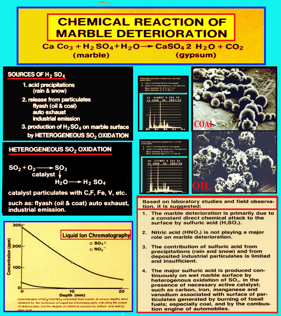 Cross sections of samples examined by both optic and scanning electron microscopy show detailed interior structure of the damaged area. The formation of gypsum crystals (CaSO/4 · 2H/2O) on the marble surface, by reaction of sulfuric acid with calcite (CaCO/3), is positively identified by dispersion staining microscopy and by energy dispersive x-ray spectroscopy.  Several parallel layers of numerous atmospheric particulates were embedded within gypsum crystals.  Elemental mapping and line profile analysis yield definite penetration by sulfuric acid 20 mm below the surface for a 50-year-old marble building.  The most damaged region is always found to be in a shady area where moisture surface is usually formed by condensation of water vapor.The concentration of [SO/4=] and [NO/3-] extracted from damaged surfaces was analyzed by the technique of liquid ion chromatography.  The extremely high ratio of [SO/4=] / [NO/3-]  obtained in marble samples, compared to the ratio generally measured from acid precipitations (rain and snow) suggests that the contribution of sulfuric acid from precipitation and from deposited industrial particulate is limited and insufficient for serious damage to the marble structure.  We hypothesize that the majority of sulfuric acid is being produced continuously on wet surfaces by heterogeneous oxidation of absorbed SO/2, in the presence of any necessary active catalysts.  Heterogeneous catalysts such as:  carbon, iron, vanadium and manganese associated with particulate which are generated by electric power plants burning fossil fuels, especially coal, and by combustion engines of automobiles (Reference 3), contribute to the complex surface chemical interactions which result in marble deterioration.