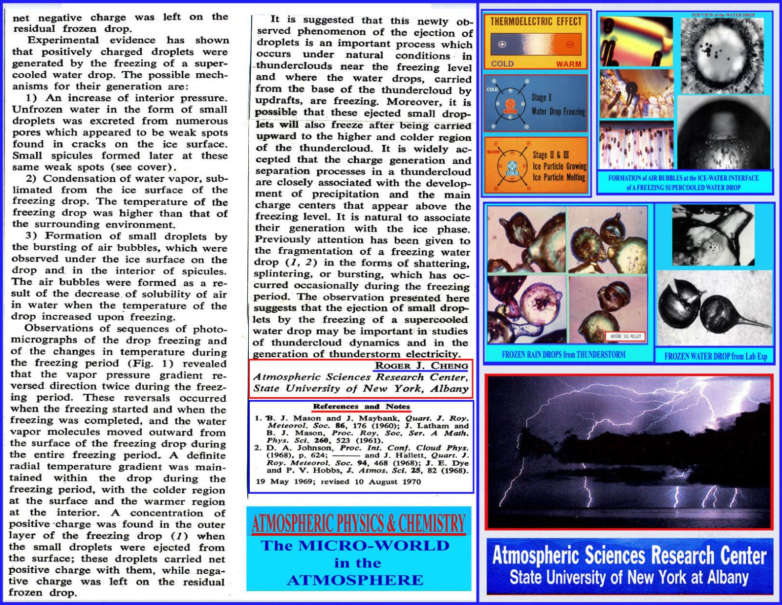 Abstract. The ejection of micro-droplets from the surface of a freezing super-cooled water drop has been observed and photographed. The fragmentation of a freezing drop in the forms of splintering, shattering, or bursting has been known for some times. This newly observed phenomenon of the ejection of numerous micro-droplets, the duration of their ejection, and the electrical properties of these droplets suggest a possible mechanism of charge generation in a thundercloud!"