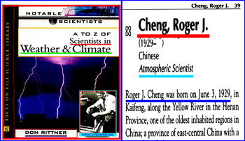 Roger Cheng joined the scientific staff of the Atmospheric Sciences Research Center (ASRC) at the State University of New York at Albany in 1968. There he worked with Vincent Schaefer and many others on the scientific staff of the ASRC. For over thirty years, aided by both the light microscope and the scanning electron microscope, his research interests ranged over a wide variety of problems. His discoveries have been recognized both nationally and internationally. One of Cheng’s early interests, along with that of Schaefer’s, was the mechanism by which ice particles are produced in clouds. His microscope observations revealed that one way is from the surface of freezing water drops. He found that they carried a negative charge. Years later, this was confirmed by cloud physicists at the Massachusetts Institute of Technology. Cheng has long been interested in the marine sea-salt aerosol. Produced by the sea, primarily by the bursting of bubbles at the surface, the small droplets of seawater are carried high into the marine atmosphere by turbulent mixing and convection. There the droplets can change phase to produce the sea-salt aerosol. It has long been assumed that sea-salt particles are solid spheres and that their mass can be calculated if one knows their diameters. But Cheng, using the scanning electron microscope, found that the particles are not solid but hollow, thus making calculations of their mass very difficult. Cheng’s discovery has been confirmed by German cloud physicists. An interesting observation made by Cheng was that sulfate particles were ejected from a droplet of seawater when it changed phase. He believes that this phenomenon can play an important role in the global sulfur cycle. From the Taj Mahal to the Imperial Palace in Peking to numerous cities in the industrialized nations, gases and particles of the world’s atmosphere are rapidly eating away at stone and monuments that have withstood the onslaught of the winds of the centuries. Cheng turned his attention to this problem. His experiments led him to believe that much of the trouble begins when sulfur dioxide reacts with liquid water on the surface of the stone to produce sulfuric acid. Small airborne particles then act as a catalyst in the reaction to change some of the stone to gypsum, a crumbly material much different from the original hard, smooth surface. Air pollution attacks not only stone but leaves on trees and other vegetation. Cheng’s experiments with a scanning electron microscope and an energy-dispersive x-ray micro-spectrometer have revealed that a concentration of industrial particulates and small sulfate crystals are found around the damaged area of the leaves. As with the case of damage to stone, the leaves are damaged primarily by sulfuric acid. Few scientists have traveled as often as Cheng has to scientific conferences around the world. Although President Nixon may have been responsible for opening the doors to cultural and scientific interaction with the People’s Republic of China, Cheng wasted little time in passing through these doors. In his first visit since he left China many years earlier, Cheng presented fourteen seminars and visited twenty-five universities, research institutes, and government and local environmental protection agencies. In the other direction, Cheng has visited and given seminars and presentations at many universities and international conferences in Europe and Russia. Cheng has received international recognition not only for the science revealed by his photographs obtained by the light microscope and the scanning electron microscope, but also for their elegance and beauty. For years these photographs have been in wide demand by editors of both popular and scientific magazines. One graced the cover of SCIENCE magazine. In addition to his published articles, Cheng was a co-author of the book Air Pollution and Control. This book, endorsed by the Director of the Chinese National Environmental Protection Bureau, was published in Chinese by the Chinese Environmental Science Service. It was distributed to national, state, and city environmental officers as a handbook and to universities and research institutes as reference materials. The book was the first of its kind in the Chinese language. In 1978 Cheng received the Chancellor’s Award for Excellence in Professional Service. This high award is granted to University professional service staff members who have demonstrated outstanding job performance. Although Roger Cheng retired from the Atmospheric Science Research Center in 2000, this has not decreased his enthusiasm for science. He has plans for more visits to China and to other countries. But best of all, he has produced a CD-ROM containing all his papers, magazine covers, and many hundreds of his photographs. This work of a very active lifetime will be encapsulated in this CD-ROM. |