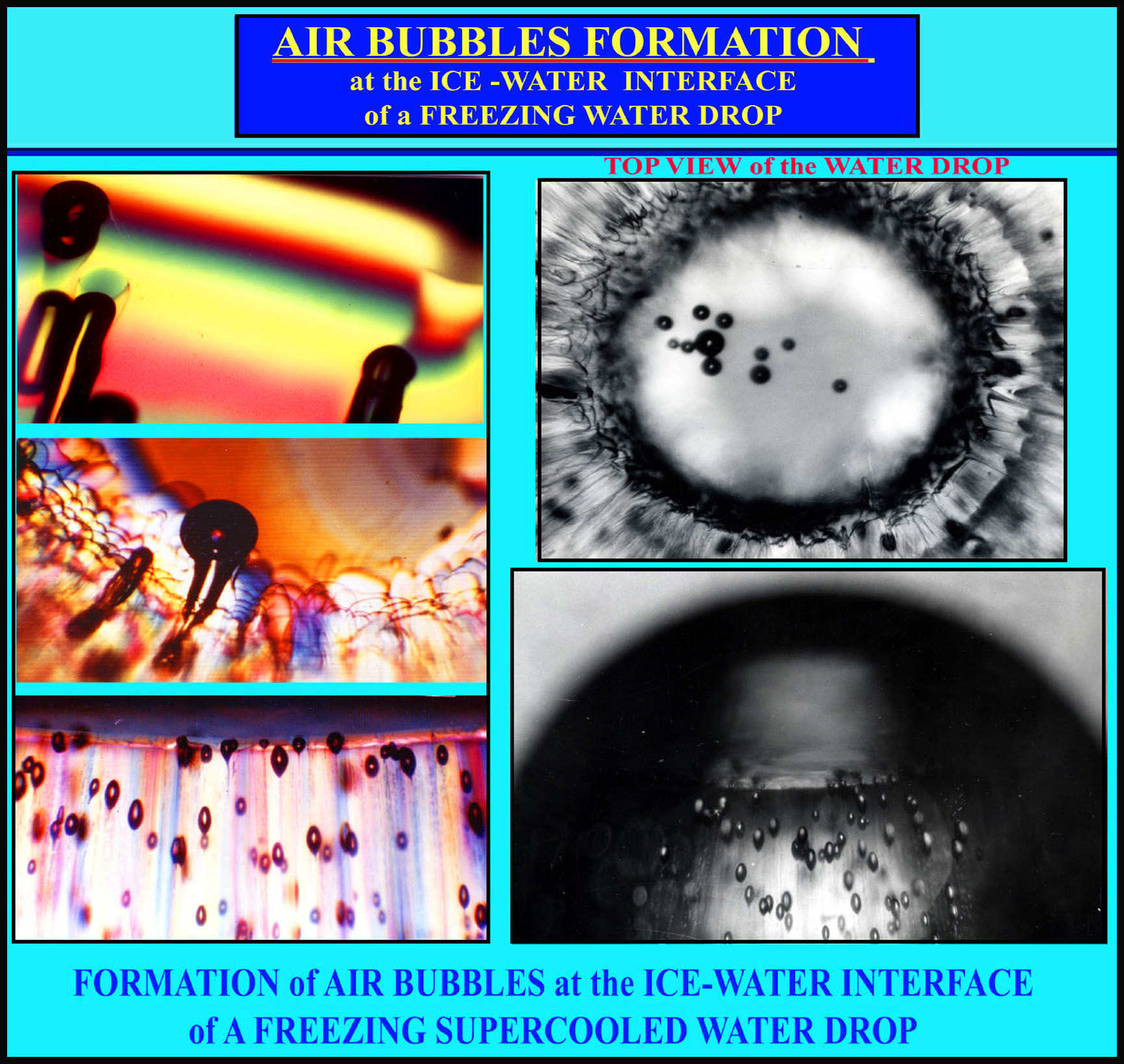 Formation of air bubbles, which were observed at the INTERFACE of ICE and WATER on the surface of the FREEZING DROP(1mm). The air bubbles were formed as a result of the decrease of solubility of air in water when the temperature of the drop increased upon freezing.