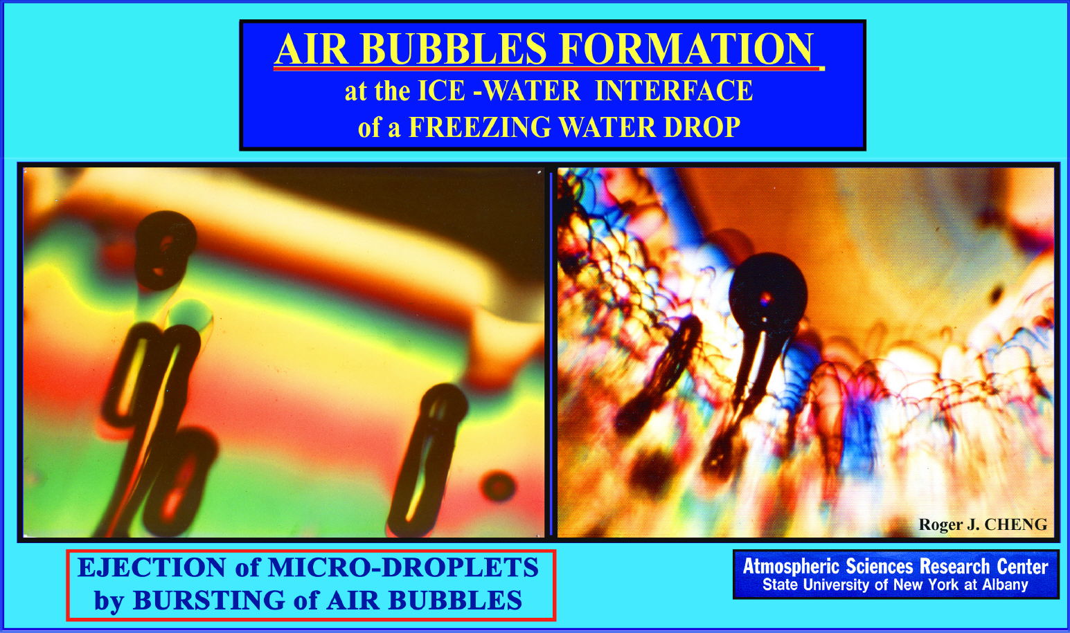A LARGE PERCENTAGE OF THE TOTAL MASS OF WATER IN THE FORM OF NUMEROUS MICRO-DROPLETS. RANGING FROM LESS THAN A MICRON TO 20 MICRONS IN DIAMETER, WAS GENERATED FROM A FREEZING SUPER-COOLED WATER DROP . THE DURATION OF GENERATION OF THESE MICRO- DROPLETS WAS 50 SECONDS FOR A 1 MM WATER DROP