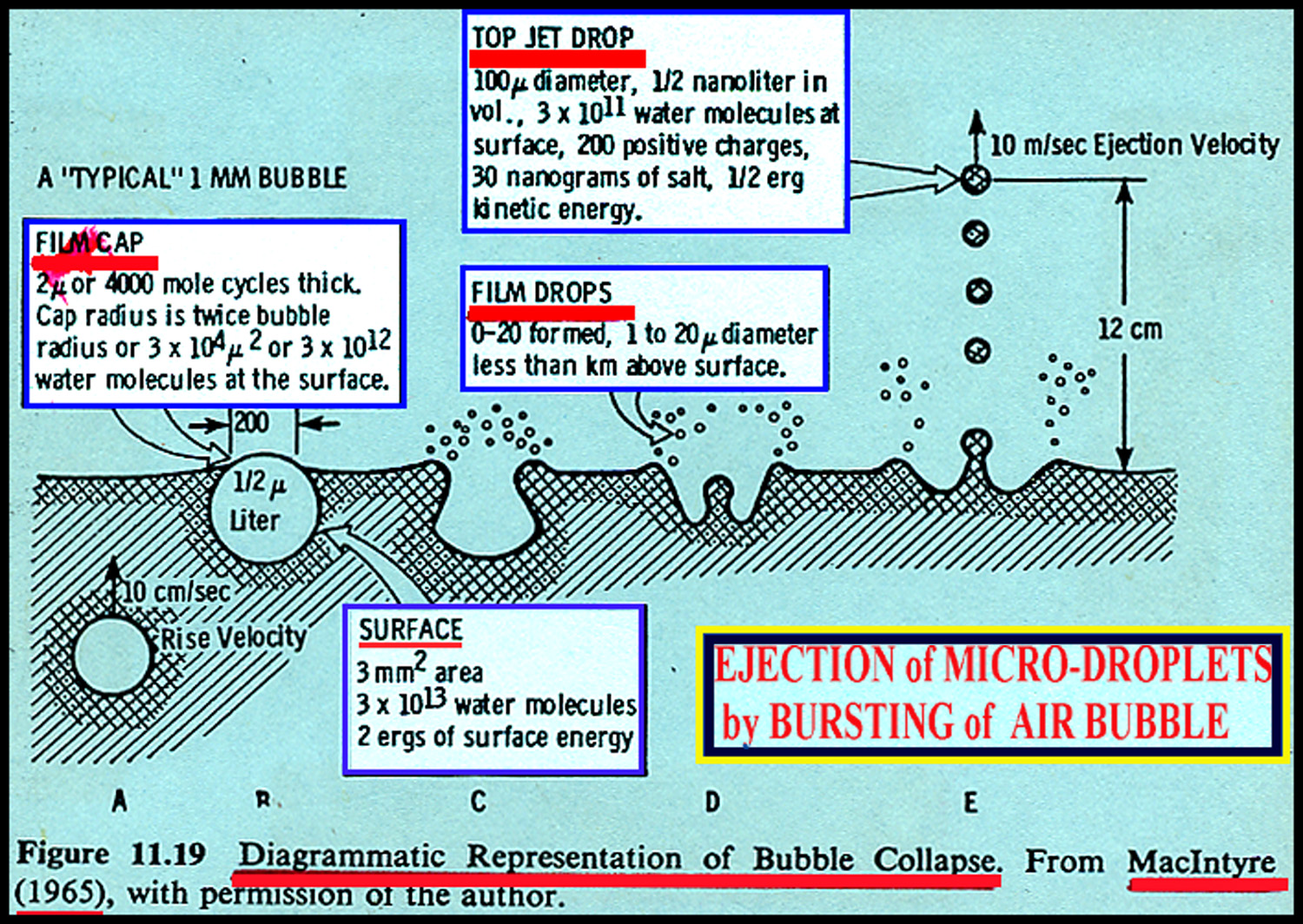 MICRO-DROPLETS WERE EJECTED BY THE BURSTING OF AIR BUBBLES RELEASED FROM A MELTING ICE PELLET OR HAIL, MORE THAN 500 AIR BUBBLES WITH AN AVERAGE DIAMETER OF 50 MICRONS WERE OBSERVED TO BE RELEASED FROM A HALF-MELTED 1 MM ICE PELLET.